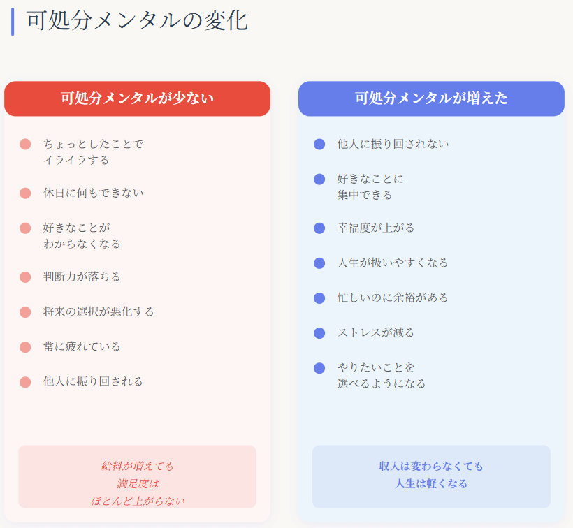 逆に可処分メンタルが増えれば、収入が変わらなくても人生は驚くほど軽くなります。