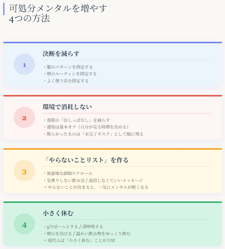 この記事では、可処分メンタルが減る仕組みと、増やすための実践方法を超わかりやすく解説します。