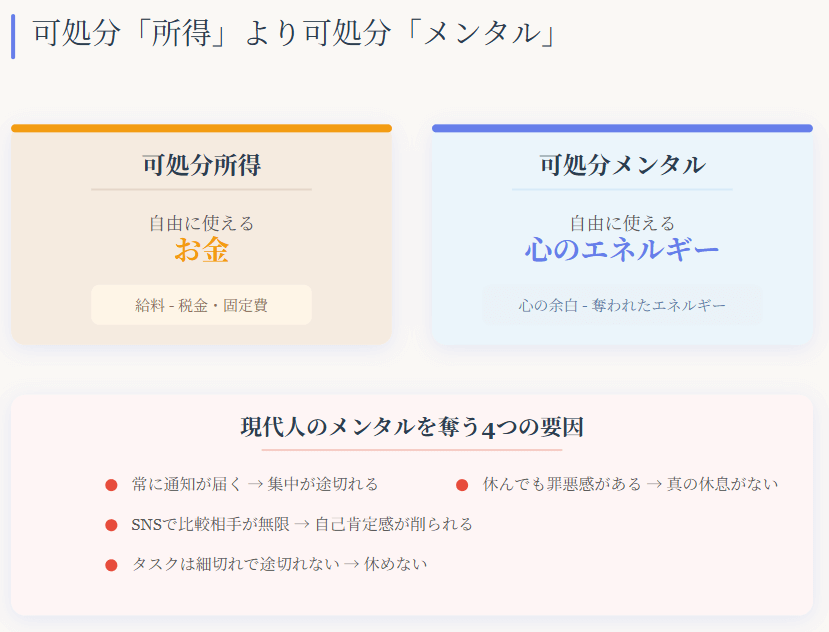 実はこれ、単に忙しいからではありません。現代の私たちが本当に不足しているのは、お金ではなく “可処分メンタル” です。