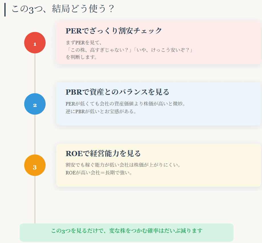 ぜひ、今日から気になる銘柄を見たら「PER・PBR・ROE」の3点セットをサッと見てみてください。