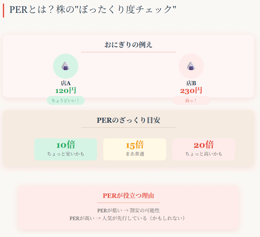 PERが低いと「割安」、高いと「人気が先行している(かもしれない)」と判断できます。