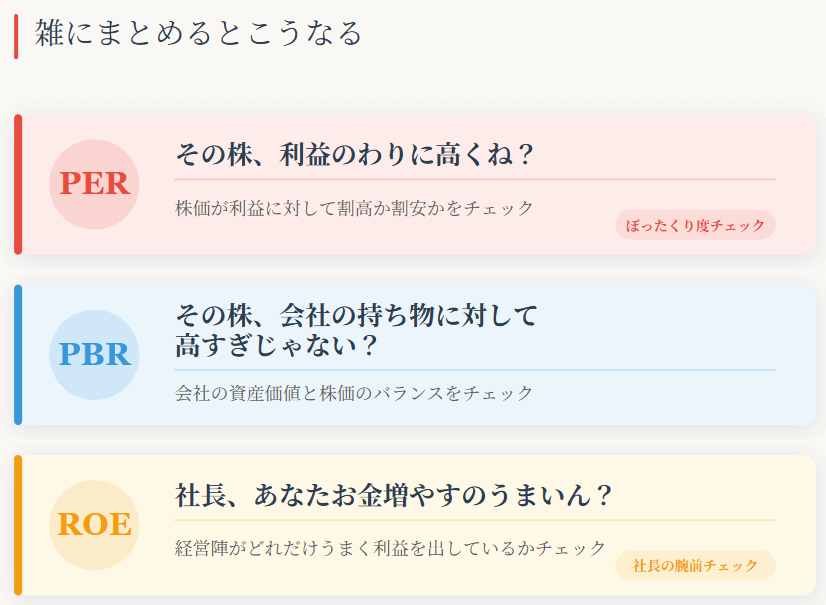 ■ そもそも PER・PBR・ROEって何?(雑にまとめるとこうなる)