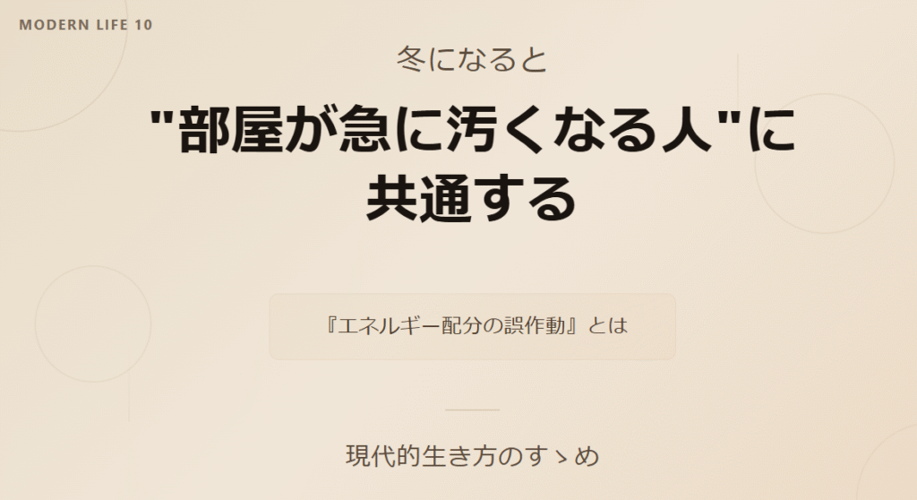 Contents1 冬になると“部屋が急に汚くなる人”に共通する『エネルギー配分の誤作動』とは2 ■ 冬は“隠れ消費エネルギー”が年間で最大になる季節3 ■ 散らかる理由:脳の優先順位が“冬モード”に強制書き換えられる4 … 続きを読む 冬になると“部屋が急に汚くなる人”に共通する『エネルギー配分の誤作動』とは