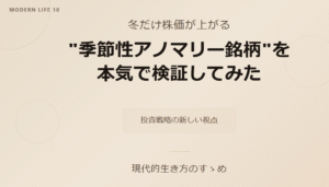 Contents1 冬だけ株価が上がる“季節性アノマリー銘柄”を本気で検証してみた2 ■ そもそも「季節性アノマリー」って何?3 ■ 【結論】冬に上がりやすい銘柄は“存在する”4 ■ 冬に強い“季節性アノマリー銘柄”5カ … 続きを読む 冬だけ株価が上がる“季節性アノマリー銘柄”を本気で検証してみた
