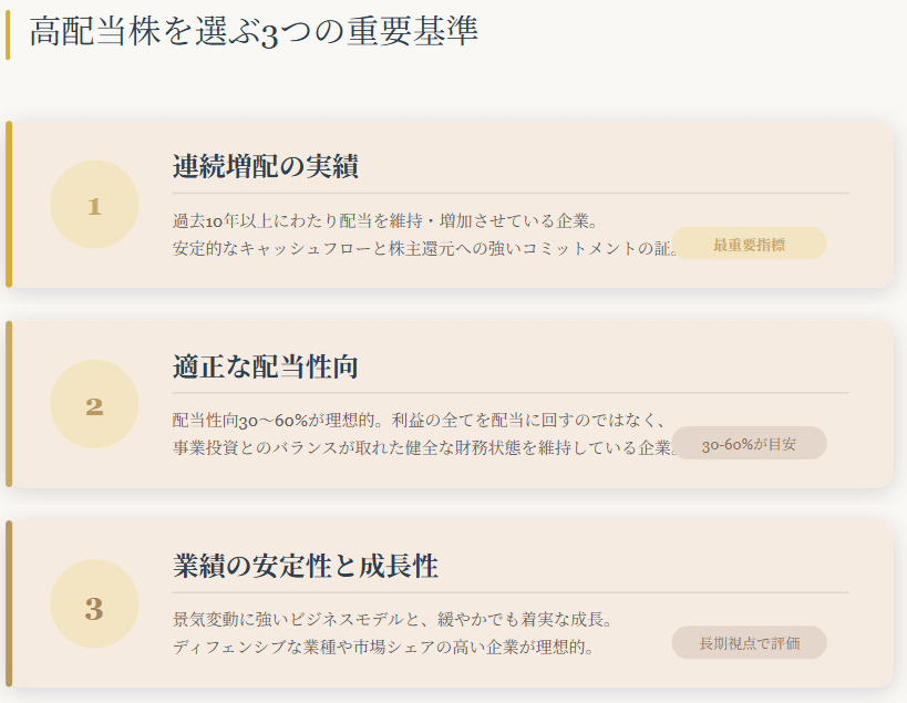 いずれも**「守りながら増やす」タイプの高配当株投資**に最適といえます。