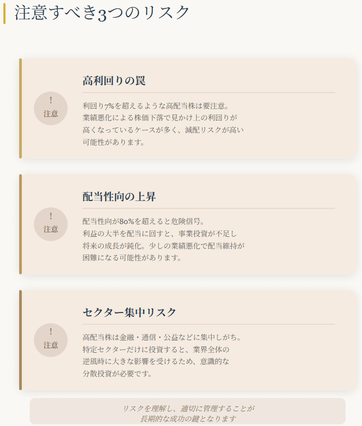しかし、単に「利回りが高い」だけでは危険です。減配や業績悪化によるリスクを避けるためには、財務の健全性・配当性向・非減配実績をしっかり確認することが重要です。